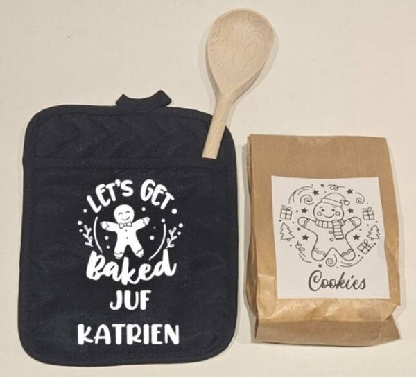 Gepersonaliseerde pannenlap gevuld met mix om lekker cookies te maken en houten pollepel.